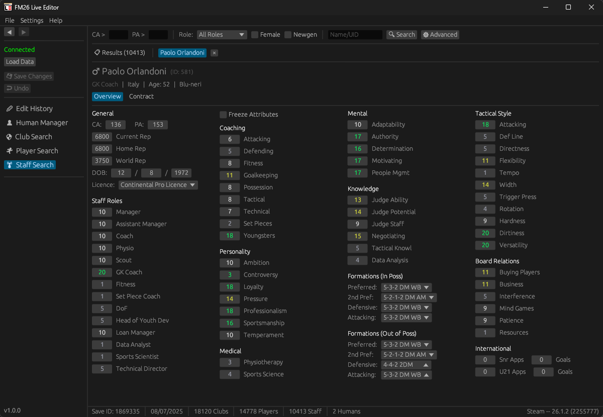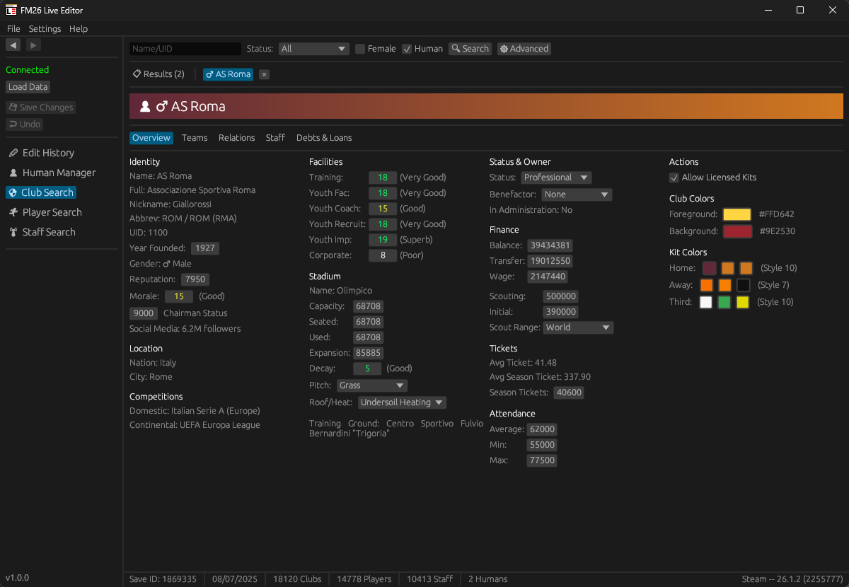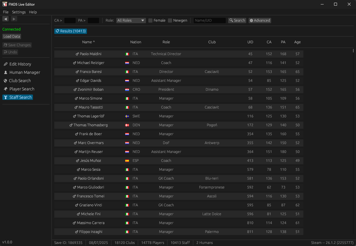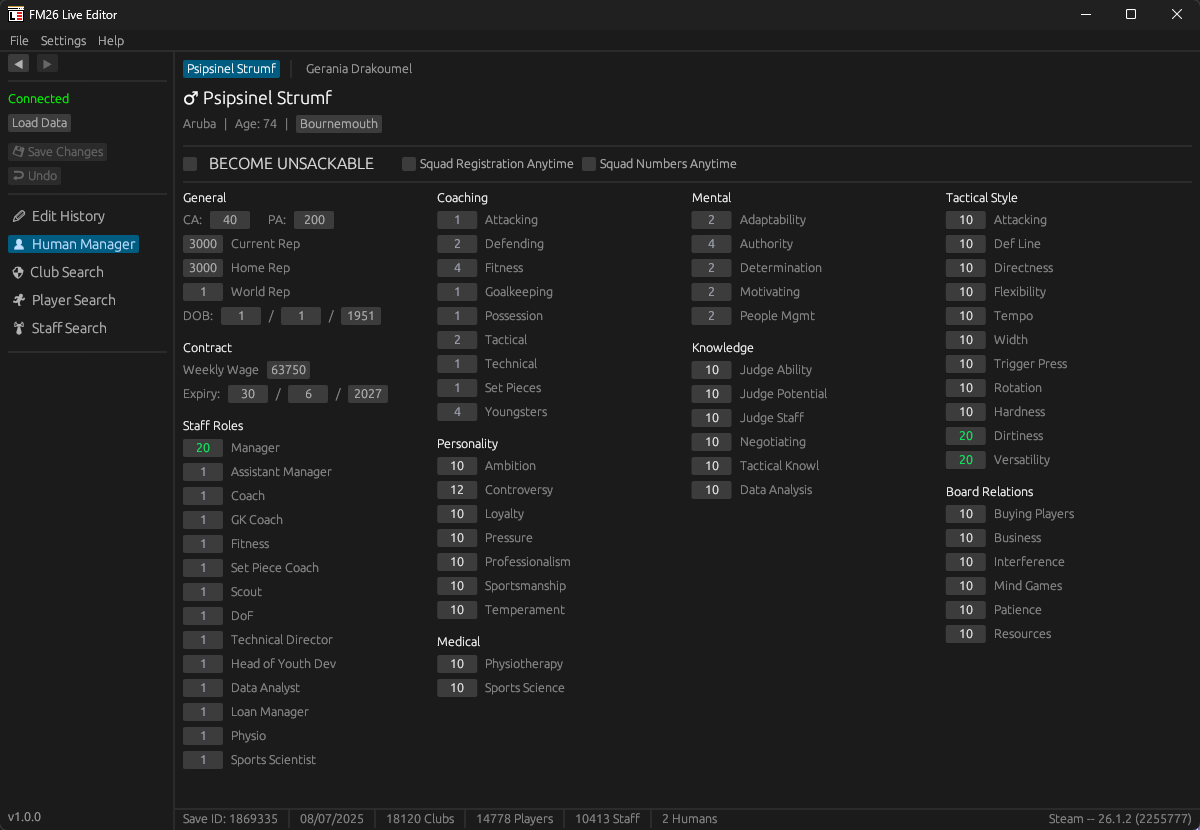 Players All attributes (with freeze option), CA/PA, positions, traits, personality, reputation, happiness, 2nd nationalities, registration, languages, fav/disliked clubs & people. |