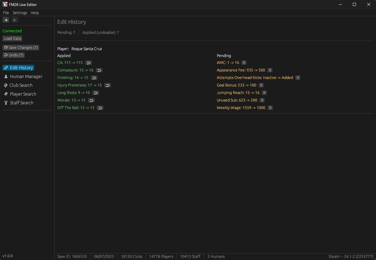 Instant Actions Heal injuries, fix fitness, remove bans, boost morale, inspire player, maximize team cohesion & tactical familiarity. Mass edit for entire squads. |
