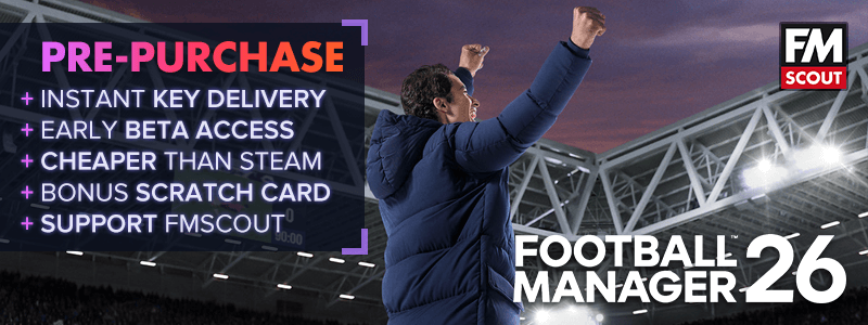 Purchase FM26 through fmscout.com much cheaper than Steam store & enjoy early access 2 weeks before release! Get a 5x chance to win a key for the 'g' edition of Genie Scout 26 & our gratitude for supporting our community financially.