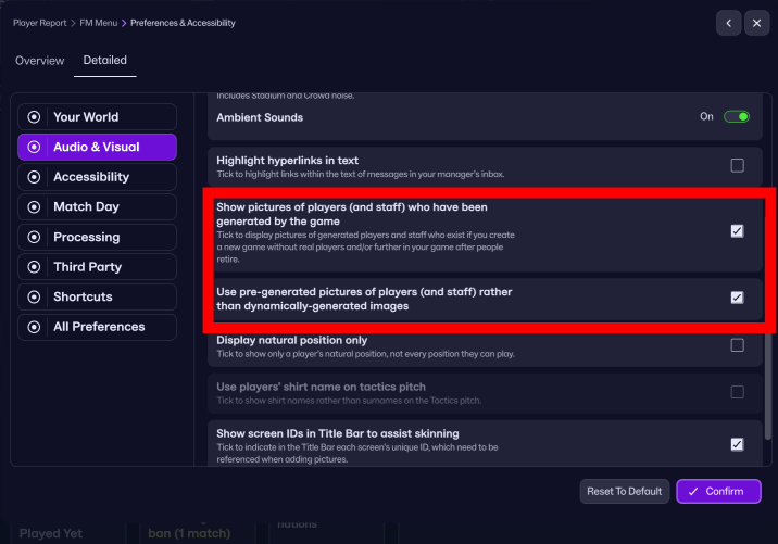 5. Start FM26, go to the Preferences screen, and select "Detailed" in the top menu. Then select "Audio & Visual" in the left menu and check the "Use pre-generated pictures of players (and staff) rather than dynamically-generated images" option (as shown in the screenshot).