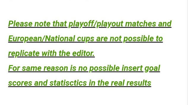 Please note that playoff/playout matches and European/National cups are not possible to replicate with the editor.