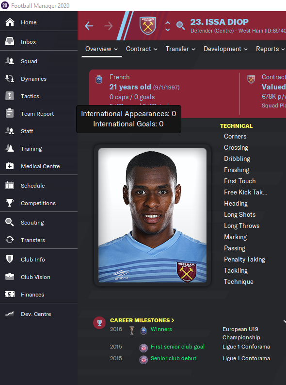 The Player Profile screen is very simple, mainly to see the most important things like personal details in the upper part, attributes and positions in the middle and stats + two small widgets with the selector below.