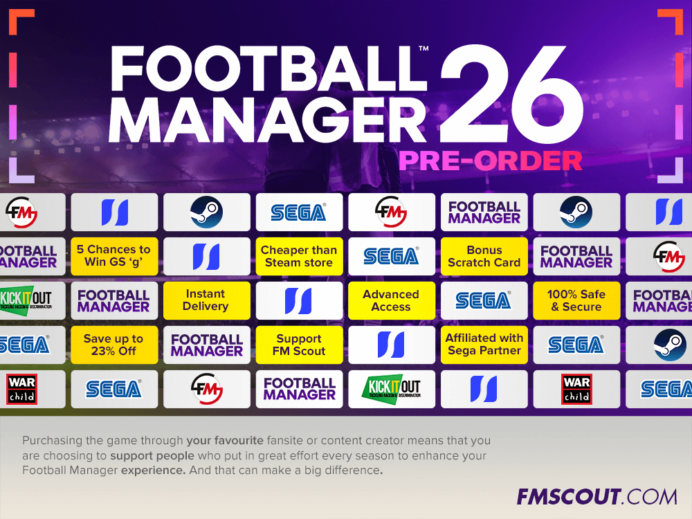 Pre-Purchase FM26 from fmscout.com to get Advanced Access to the Pre-Release Beta version, 5 chances to win the 'g' edition of Genie Scout 26, and our gratitude for supporting our community financially.