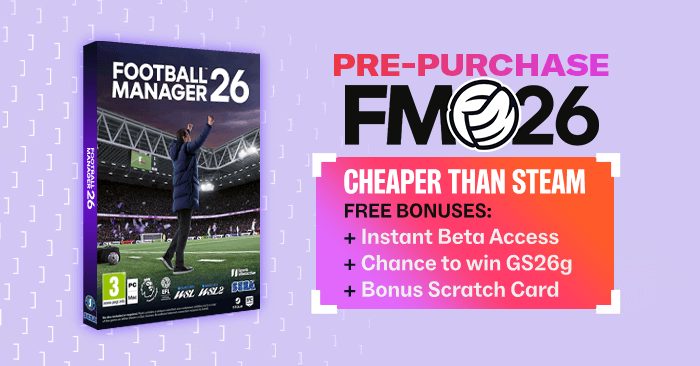 Purchase FM26 through fmscout.com much cheaper than Steam store to enjoy immediate access to the Beta version, get a 5x chance to win a key for the 'g' edition of Genie Scout 26, & our gratitude for supporting our community financially.