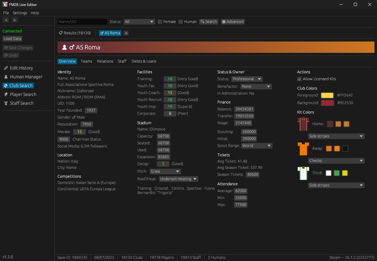 - Clubs: Edit finances, facilities, stadium details, kit styles/colors, relations, benefactor status, and more.