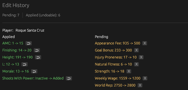 Smart History is a unique feature you won't find anywhere else. It's refreshing and, frankly, a game-changer for peace of mind.Say you're on a player profile and want to edit Finishing to 20. Doing that adds a red border around the field and will also create an entry in the Edit History screen.