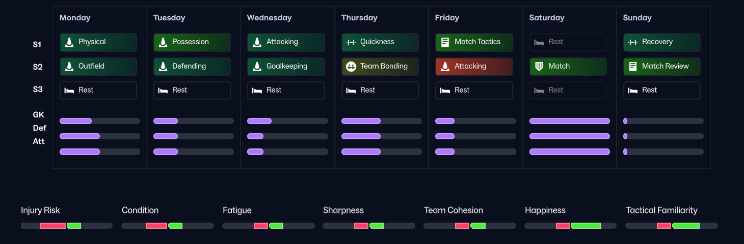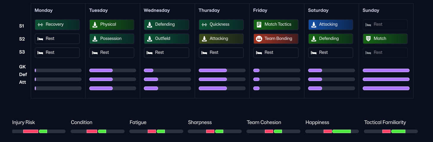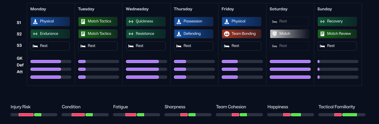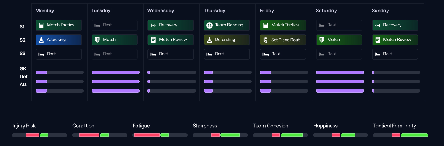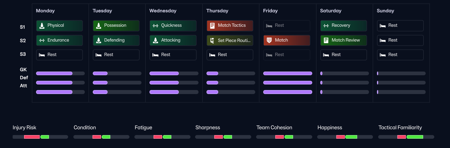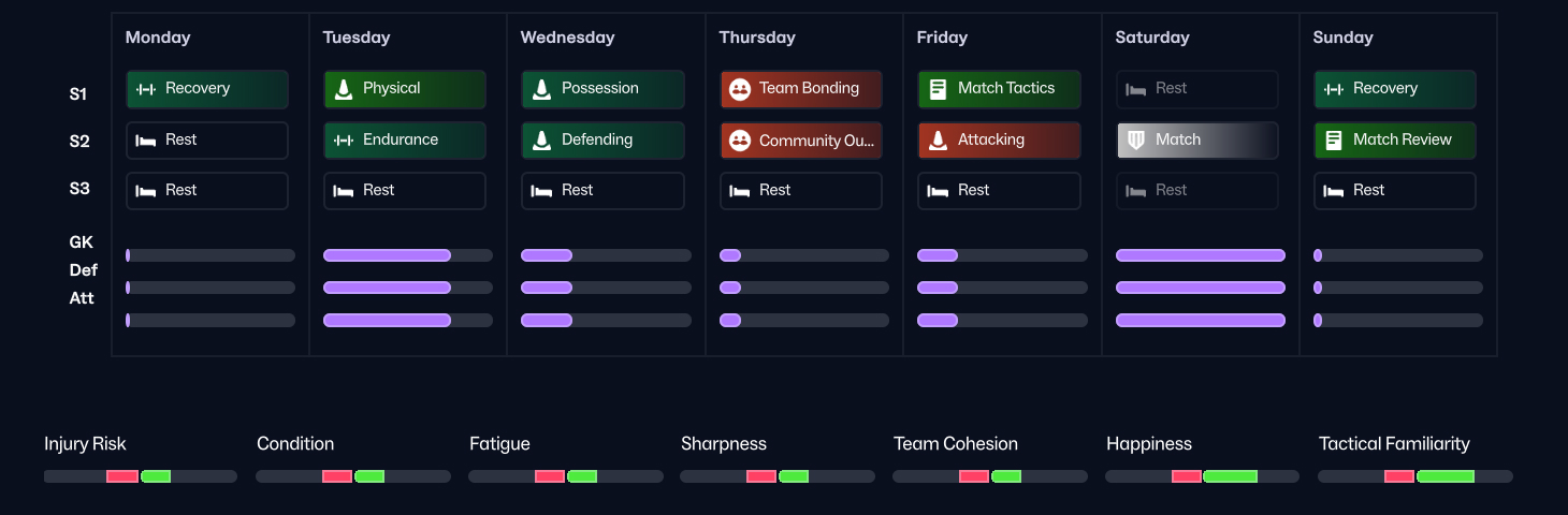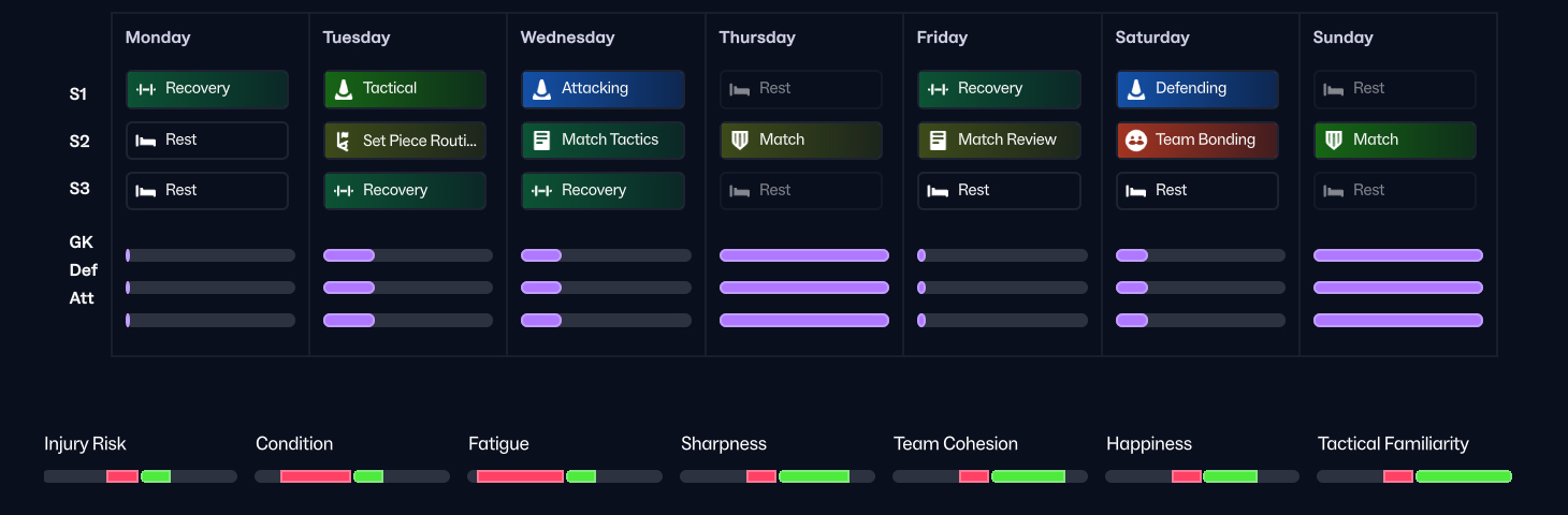 💡 The "Rest vs. Recovery" Myth You might notice these schedules use Rest sessions more often than Recovery. This is intentional. A common mistake is spamming Recovery sessions thinking it heals players faster.