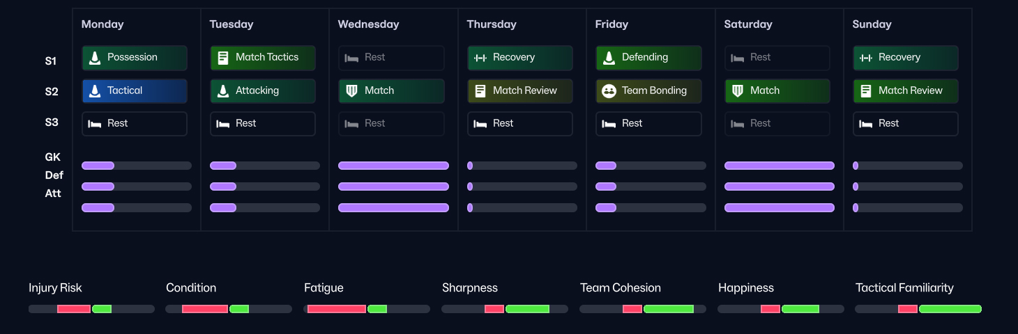 Action: When a new week starts after a Sunday game, please manually ensure that Monday Slot 2 is set to "Match Review" and Slot 1 is "Recovery".