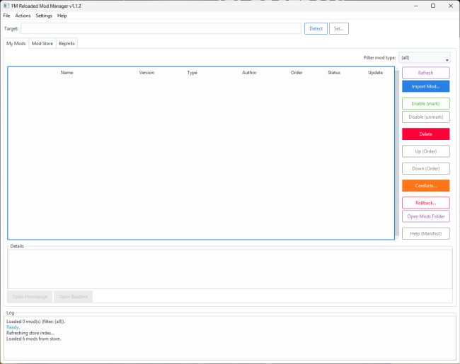 -  Tabbed Interface — My Mods, Mod Store, and BepInEx tabs