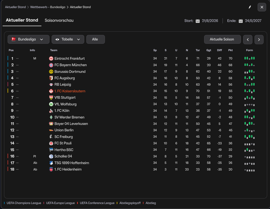I tested the Asymmetric Grogu Tactic with 1. FC Kaiserslautern during the first season after their promotion from the 2. Bundesliga. Despite being newly promoted, the team performed impressively thanks to this dynamic and unpredictable tactical approach. This Tactic took me to 6th Place finish and made me the winner of the DFB Pokal.