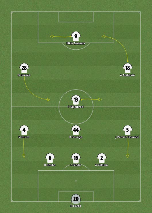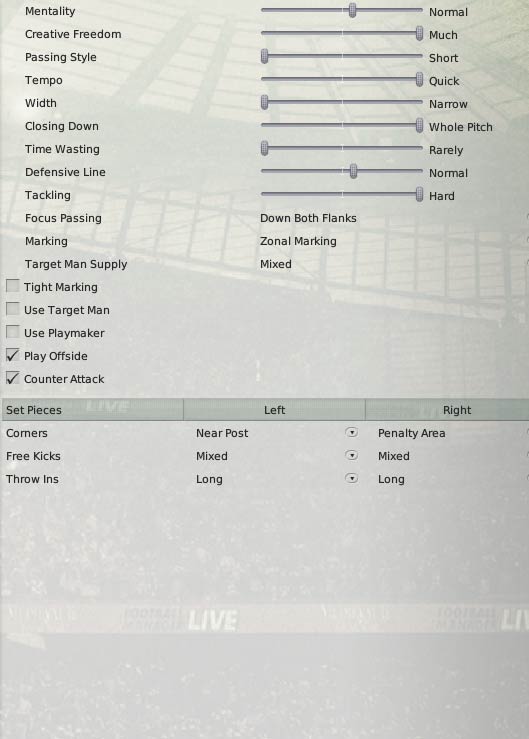So far, I'm using this tactic in the last 4 games, I snatched a draw with Man City away (1-1) and Man Utd home (0-0), I won Arsenal home (2-1) and I won Birmingham home (3-1). Before I used this tactic I got a draw with Everton away (0-0) and a big loss to Tottenham away (1-3). After six games, I stand in 8th place. I hope this tactic will help me to finish above the relegation zone.