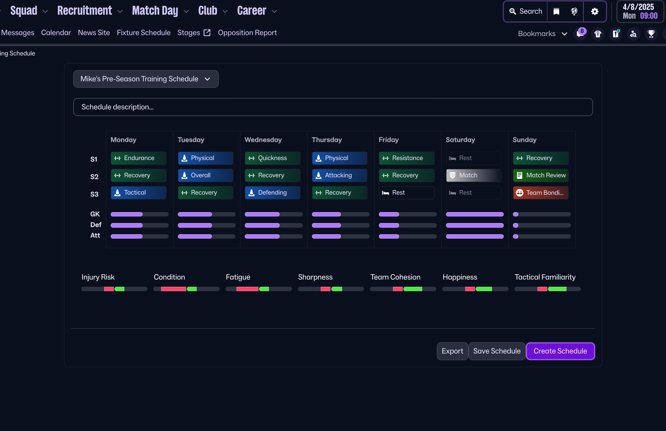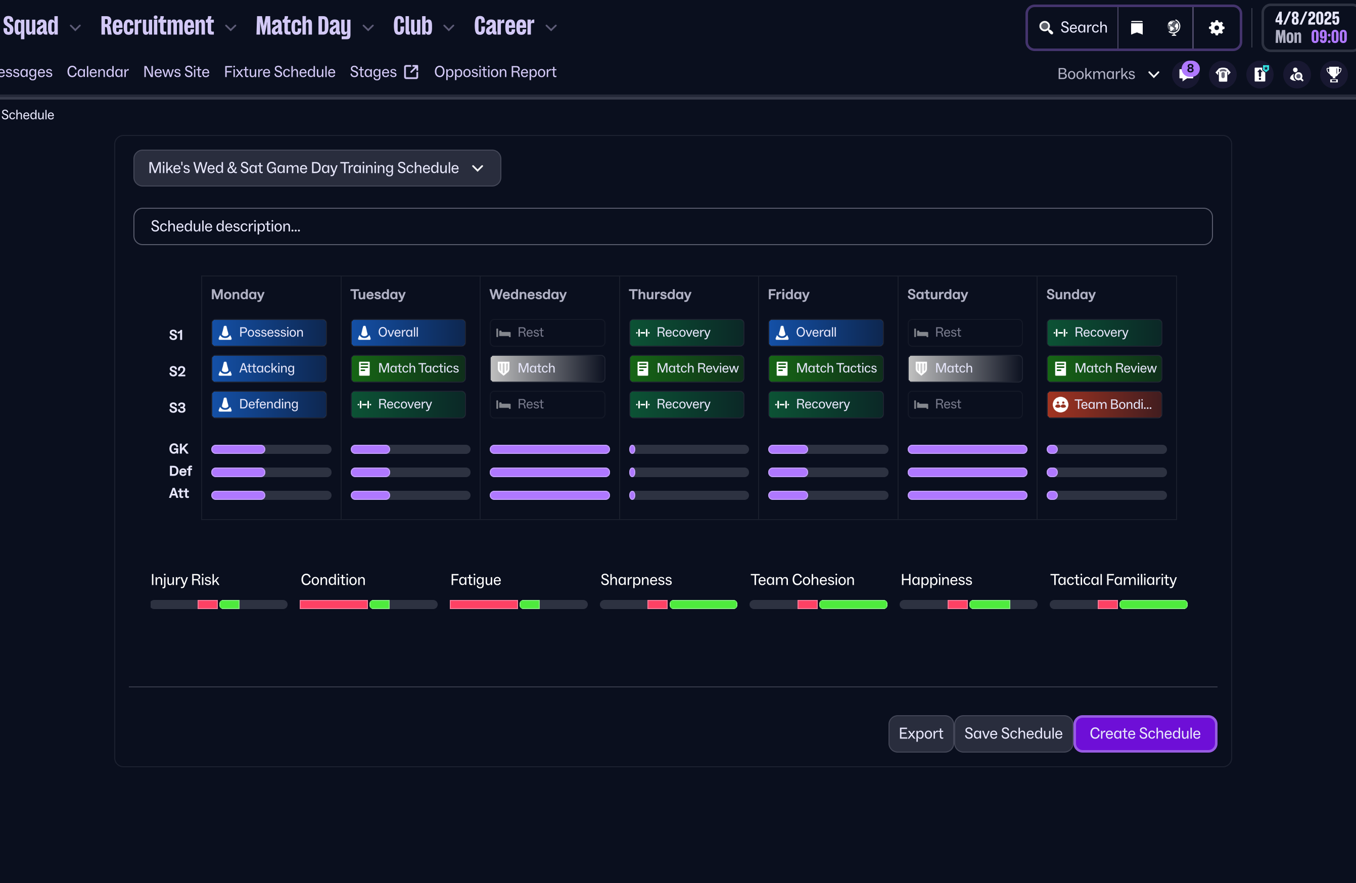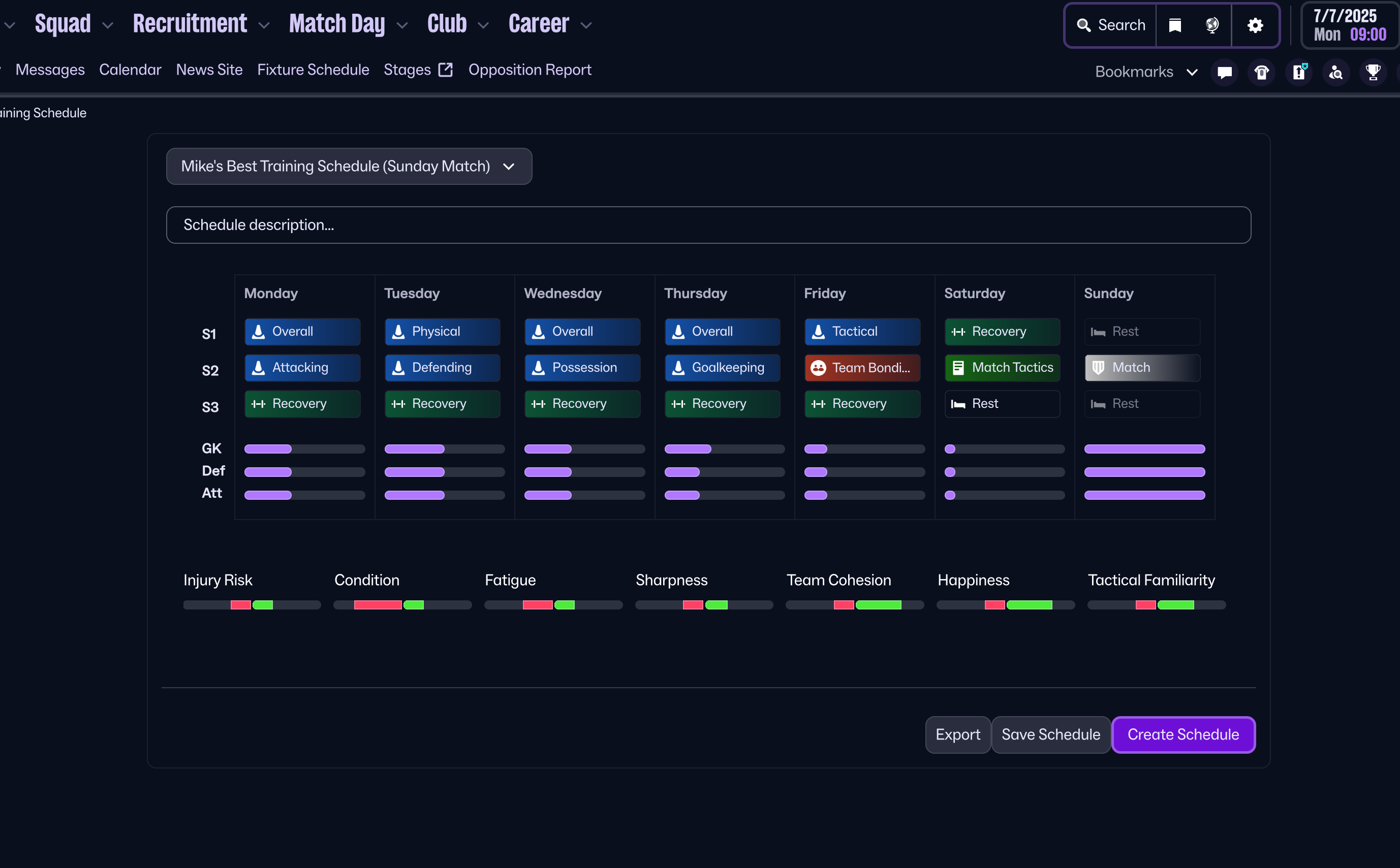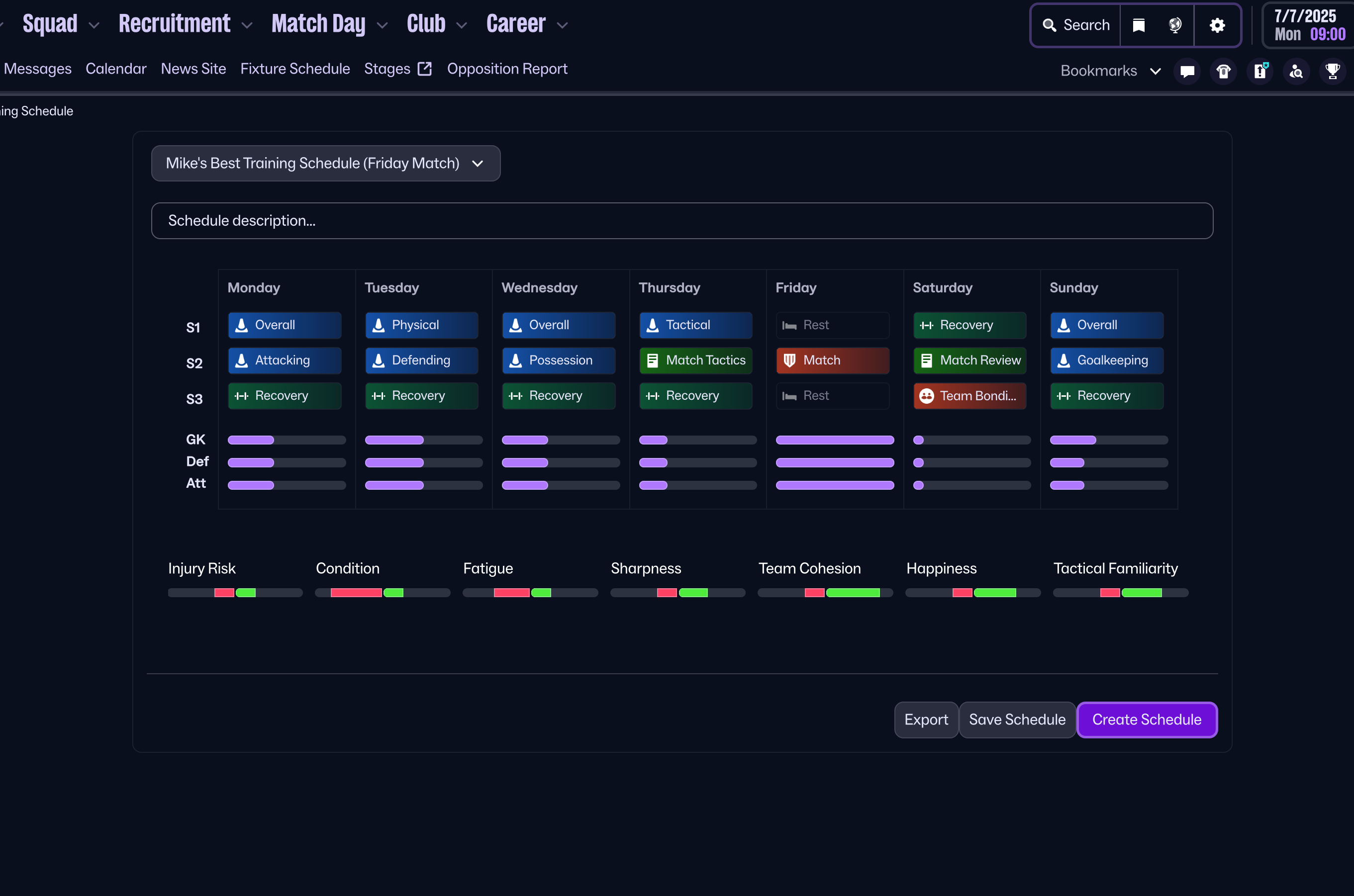 I have vigorously tested my main schedule (Mike's Best Training Schedule v.1) throughout the beta and have been having great success with it, massively improving team cohesion, tactic familiarity and most importantly players attributes.