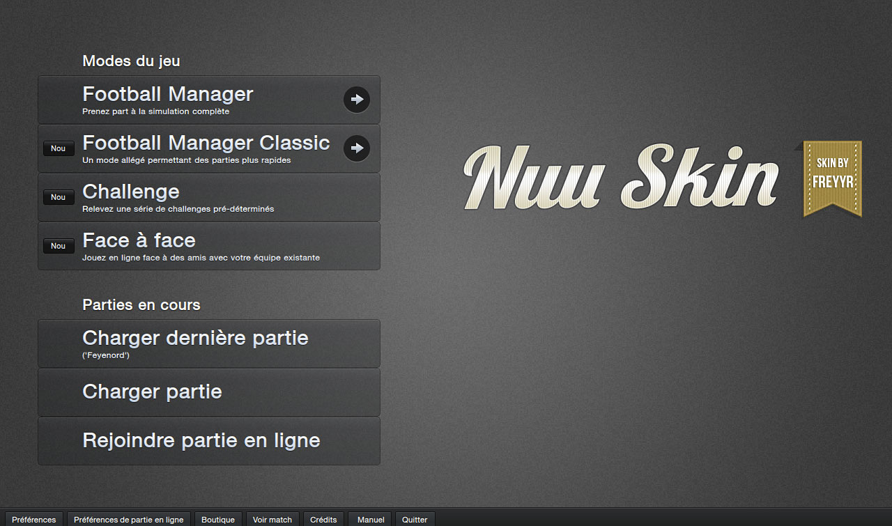This skin is created by Freyyr from FM Graph.To change TV logos in match mod, choose your new channel logo in the folder nuu/graphics/icons/logos and rename it "Canal +.png"
