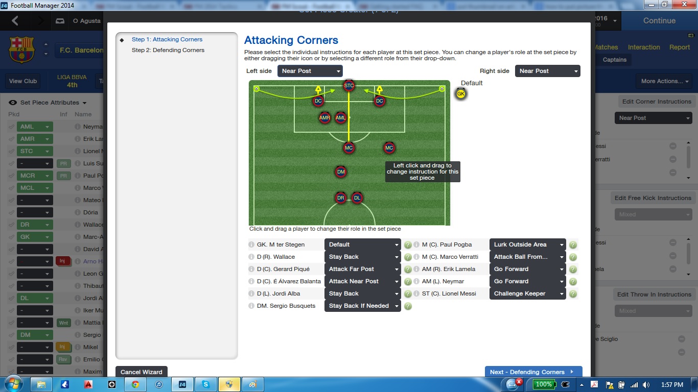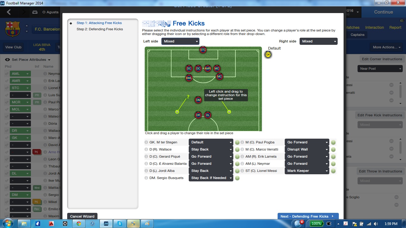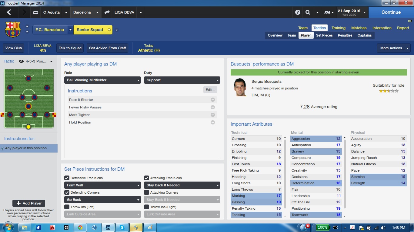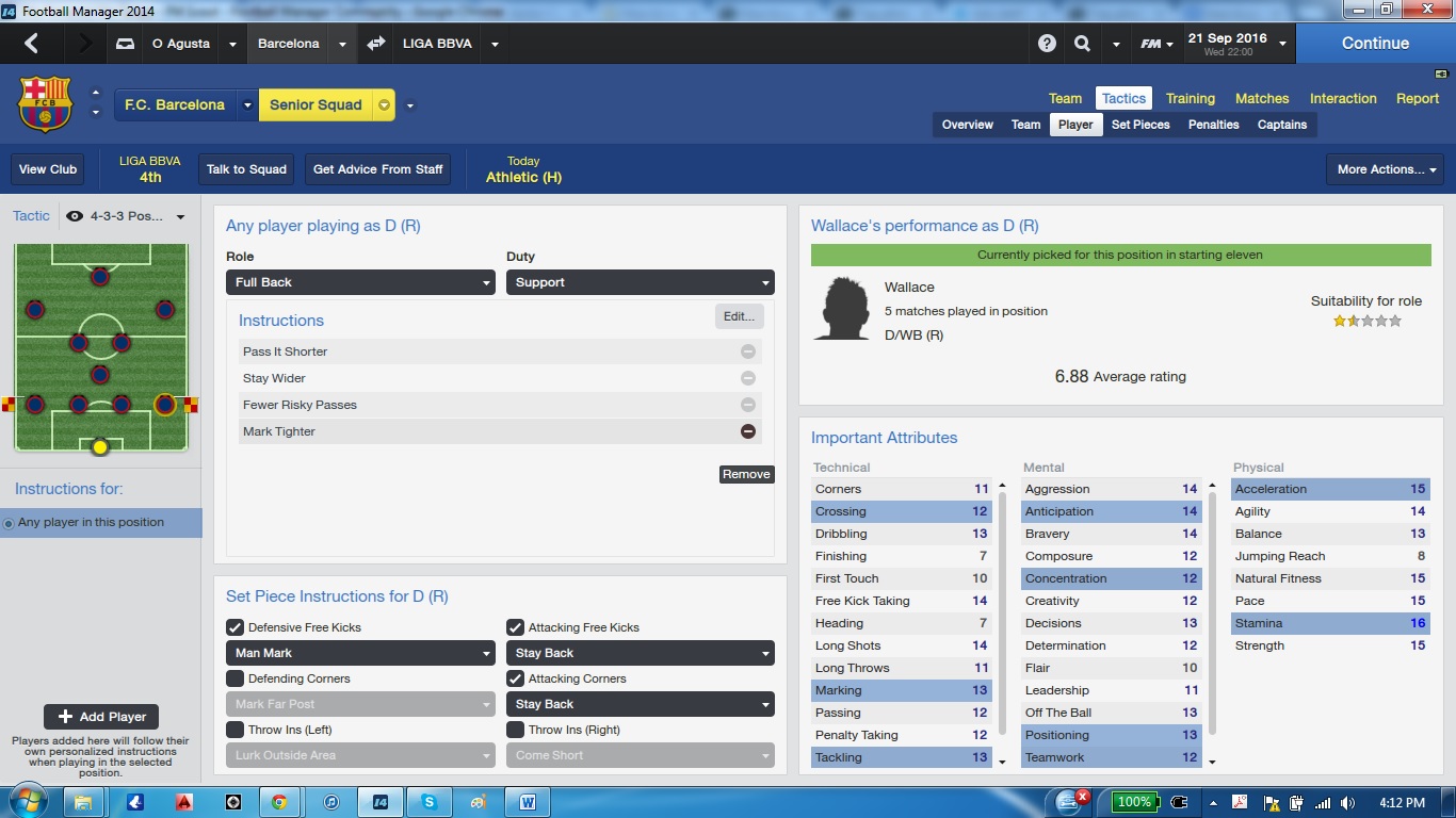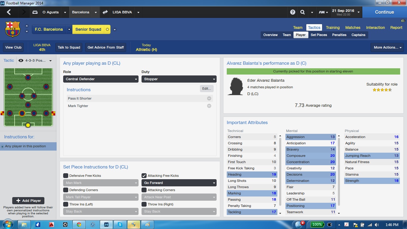 The defense utilizes 2 fullbacks and 2 stoppers. Two fullbacks with support duty will provide balance between defense and offence and they will stay wide to support players in front of them and provide overlapping run. Two stoppers will close down opposition straight away to deny them space and win the ball back. This function works well with ‘use offside trap’ instruction. In offense they will provide short simple passes. In my save game, Balanta and Pique have developed into defensive beasts.