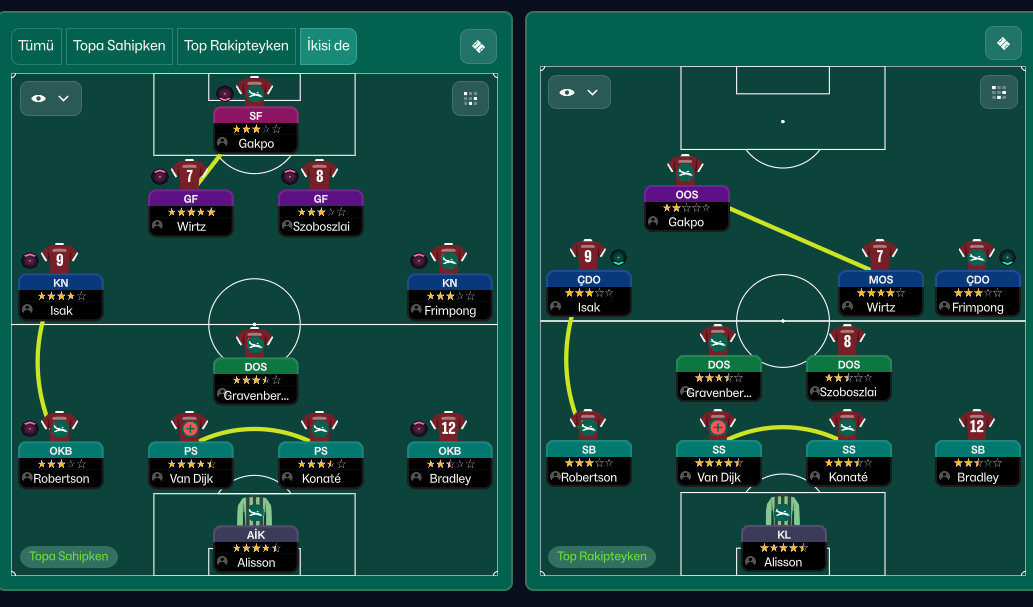 In the middle Wirtz and Szoboszlai, on the flanks Isak and Frimpong are already positioned to explode forward.