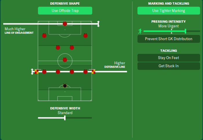 - Offside trap: We will initiate this instruction by default although we MUST PAY ATTENTION TO THE RIVAL, it does not make any sense when the opponent has a `` Target Man '', who´s a positional striker, rather it is an adequate instruction for those strikers that look to exploit open spaces. For example, the Advanced Forward. Therefore, Offside yes, but with a head.