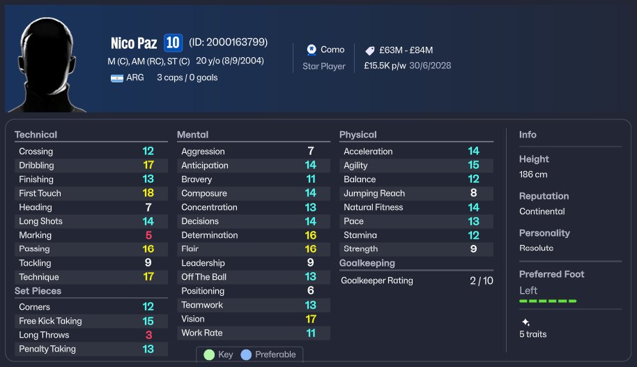 Here's a FM26 screenshot of Nico Paz on day 1.