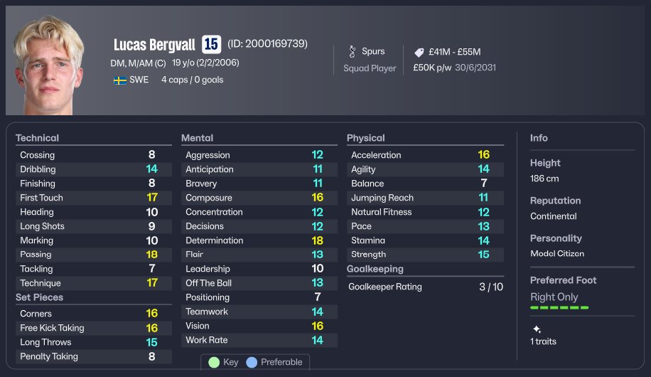 Lucas Bergvall is a Swedish international, playing for Tottenham in the Premier League.At the start of season one in-game, he will have a CA of 140, aged 19.