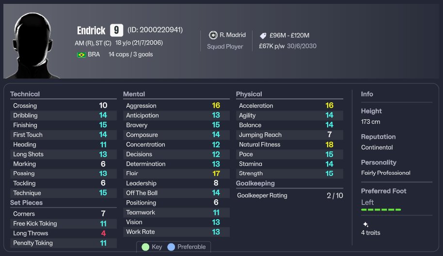 At the start of the first transfer window, Lamine will have a CA of 165, which is significantly higher than Endrick's CA.That's already a world-class ability and he's still aged 18.