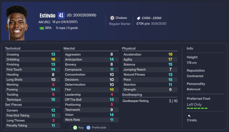Estêvão is the same age as Endrick and Yamal.At the start of season one in-game, he will have a CA of 132, aged 18.