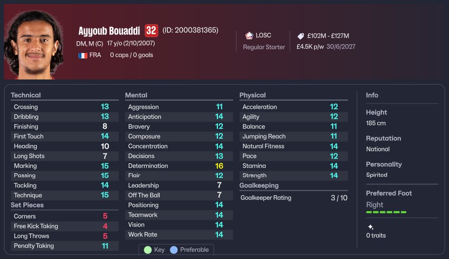 Here's a FM26 screenshot of Ayyoub Bouaddi on day 1.