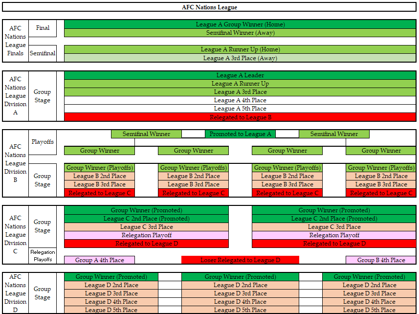 - AFC Nations League: 47 nations split into 4 divisions (Leagues A to D) of 6, 16, 10, and 15 teams respectively, with fixtures played home and away. The AFC Nations league is held every 4 years (starting from 2026) instead of 2 due to the fixture congestion for AFC nations, who also play regional confederation competitions in differing windows. The tournament format is as follows (please refer to the format image as well):
