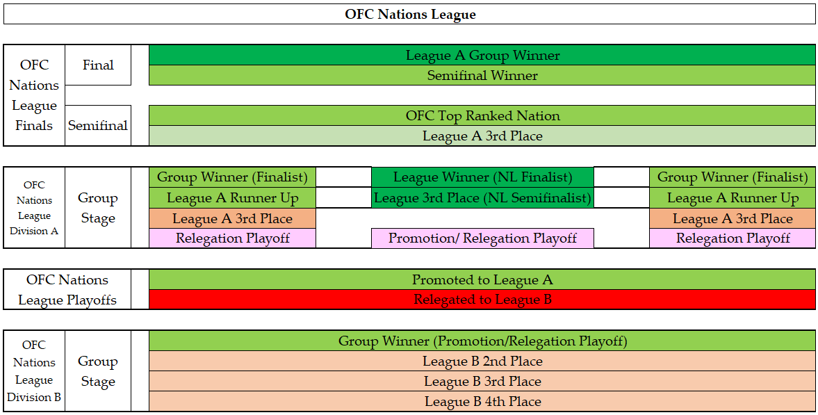 - OFC Nations League: 13 nations (including associate nations Tuvalu & Kiribati) split into 2 divisions of 8 and 4 teams respectively (with the highest ranked OFC team directly qualifying to the Finals due to reputation disparity), with fixtures played home and away. The OFC Nations league is held every 4 years (starting from 2026). The tournament format is as follows (please refer to the format image as well):