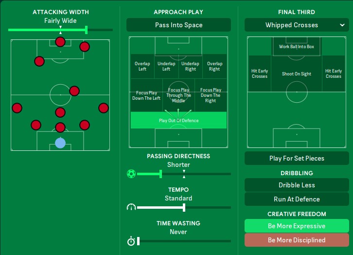 There isn't much you'll need to change on the team instructions except for the obvious. A bit higher tempo and more offensive mentality when you're the favorite and/or need a goal. Maybe add “hit early crosses” too. Balanced mentality and maybe a bit slower tempo to not lose the ball to often when you're the underdog.