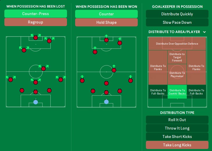 Such a narrow formation doesn't just mean that the passing distances are short but also that you always have enough players close to the ball to counter-press. Without telling your players via team instructions to play a high press. It just happens naturally. The only thing the opponents often can do when taking the ball away from us is hitting the ball long in pure desperation.