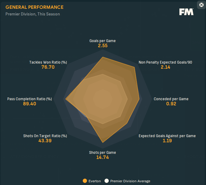 You can expect beautiful play and goals from this tactic. Finished way over expectations with a very weak Everton side with no depth or finances.