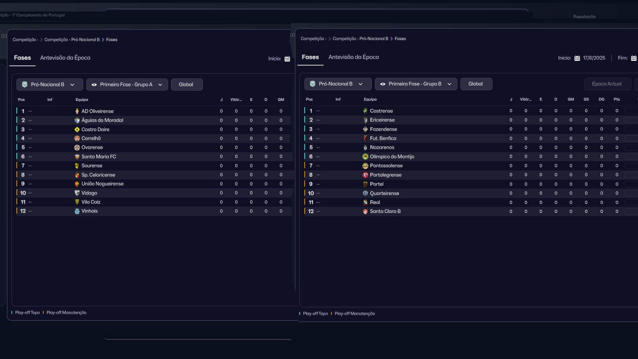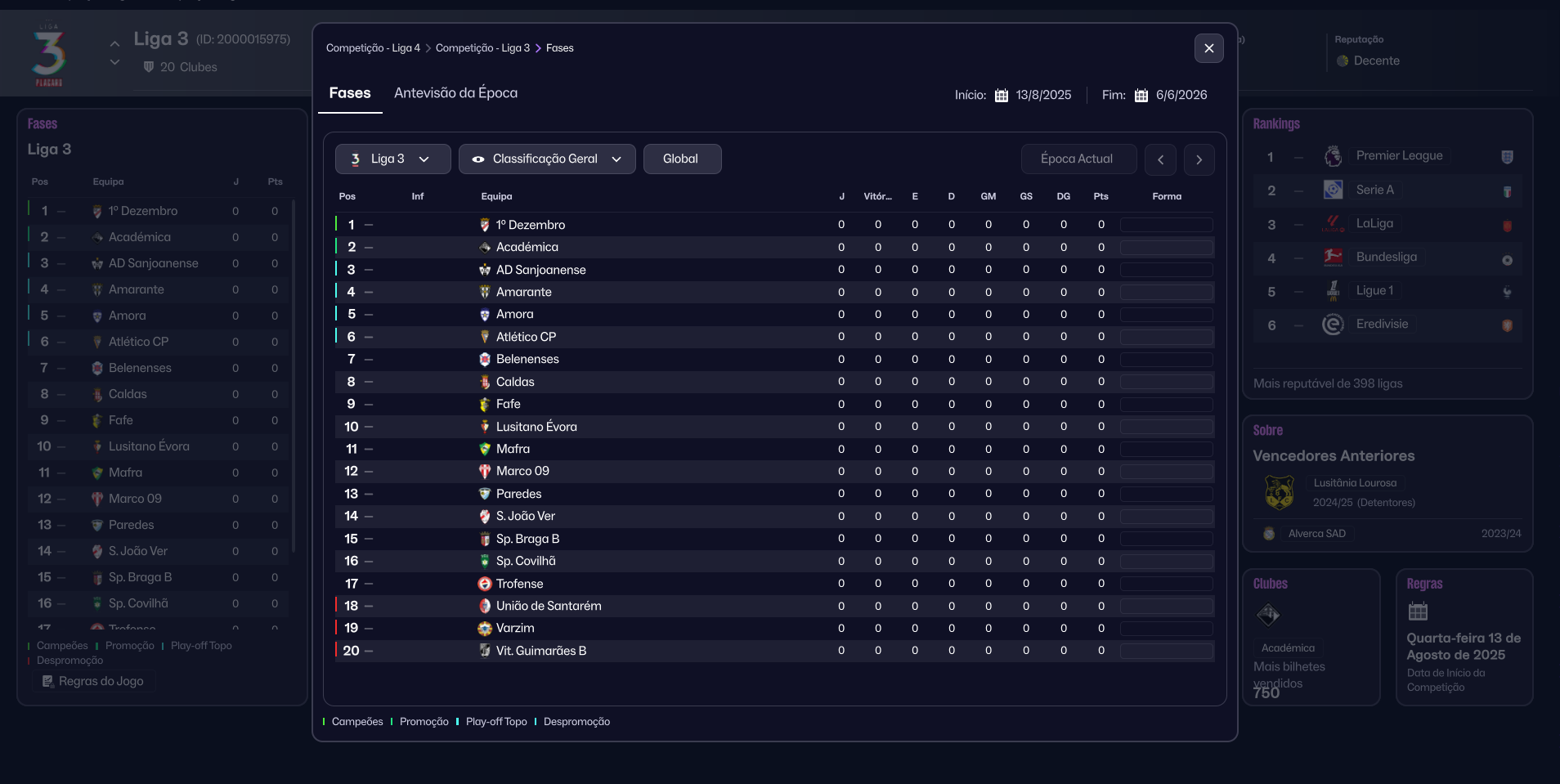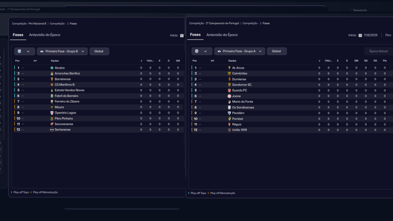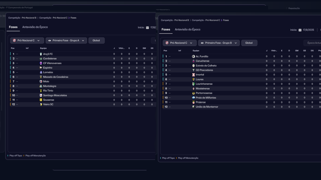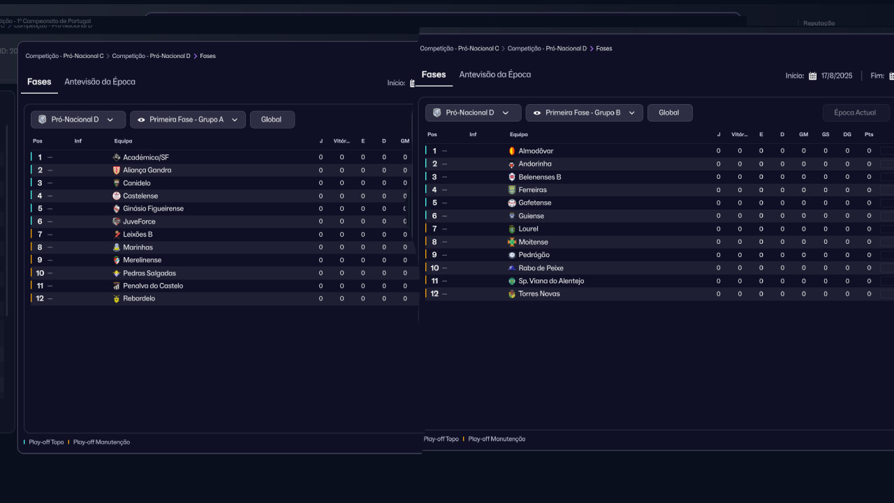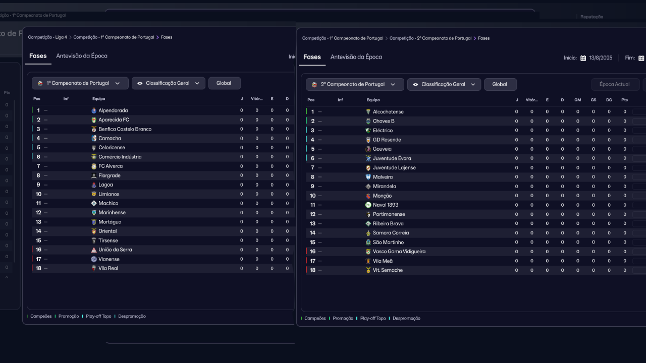 A reorganization of the portuguese football structure in a pyramid, that can go as low as 15 levels! The ultimate challenge for those who want to reconnect with the game, and the best database for those who love to play lower league on Football Manager! You can check every playable team below.