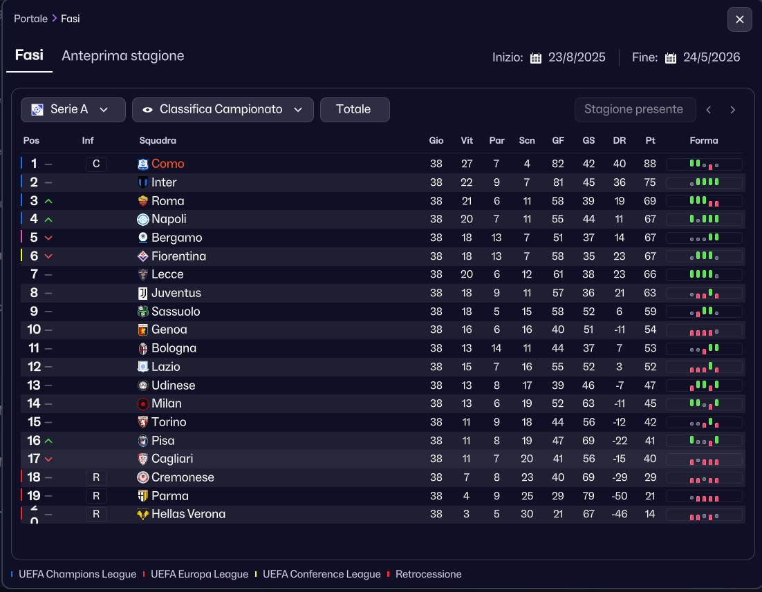 Performance Metrics: Como's aggression is confirmed by statistics: they ranked fifth for PPDA (Passes Per Defensive Action) and third for Challenge Intensity in the last Serie A season, indicating an intense, high press. The relatively low number of interceptions confirms Fàbregas' preference for aggressive man-to-man competition for possession over passive screening.