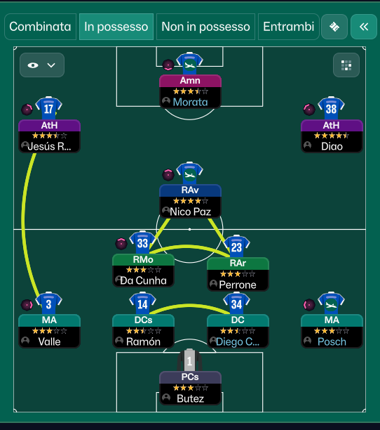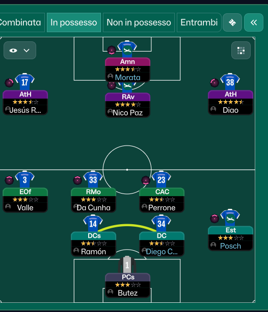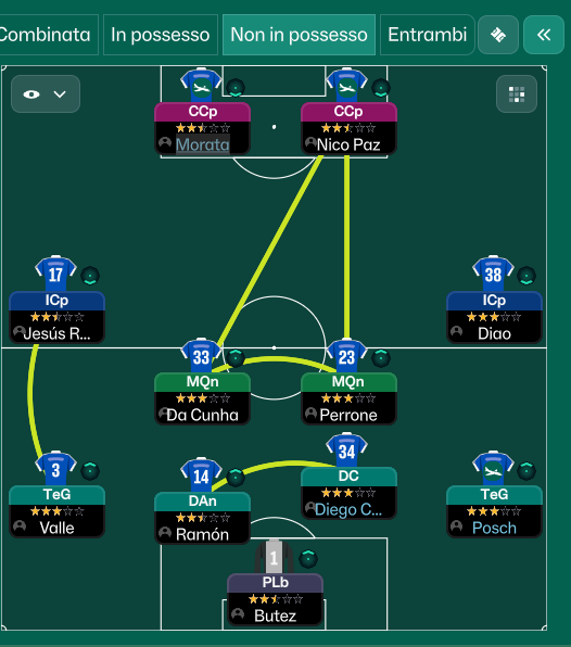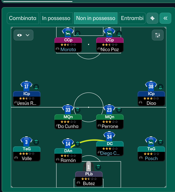 It is practically impossible to reproduce all the endless tactical solutions of Fabregas’ Como in a single tactic in Football Manager 2026, also because Como change shape during the same match depending on how the opponent defends and presses. When building from the back, Como can line up in a 1-2-4-4 (with goalkeeper Butez and the two centre-backs involved in the build-up and the two full-backs Valle and Posch high on the line of the asymmetrical holding midfielders, with Perrone deeper than Da Cunha), in a 1-3-3-4 with one of the full-backs, usually Posch on the right, inverting and tucking inside while the other, Valle, stays high and wide almost on the halfway line, or again with Perrone dropping between the two centre-backs, freeing space for the full-backs who act as wide wingers. For this reason, it is necessary to create at least two tactics: one that mirrors the central build-up with the two inverted full-backs acting as additional midfielders and the two wingers starting wide (only initially, since they drive inside when in possession), and another that mirrors the build-up with three centre-backs (plus the goalkeeper) with the holding midfielder dropping between the two centre-backs and freeing the full-backs to push high and wide. Naturally, the in-possession instructions differ between the two tactics, as do the players’ roles, while the out-of-possession phase is practically unchanged.
