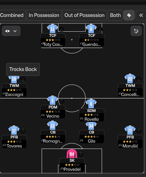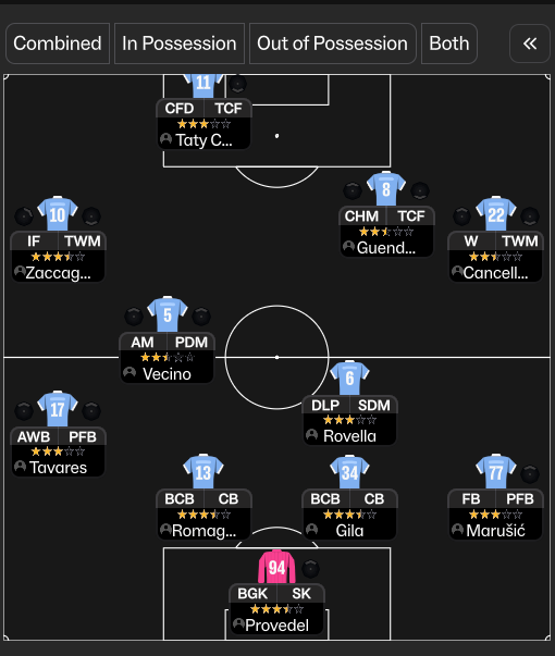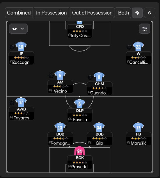 this is my emulation of Maurizio Sarri's Lazio 2025-2026 4-3-3 tactic. With this tactic I won Scudetto (Serie A title) and Coppa Italia (Italy national cup), 96 points in serie A, 94 goals scored (best attack) and 32 goals allowed (best defense).