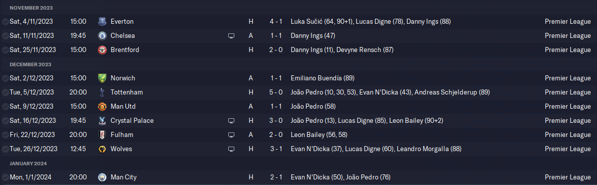 We started the year 2024 with perhaps our most enjoyable victory yet as we beat Manchester City 2-1 at Villa Park. We managed to limit their scoring chances and were clinical enough ourselves to snatch 2-1 win against the most OP team in this year's FM.