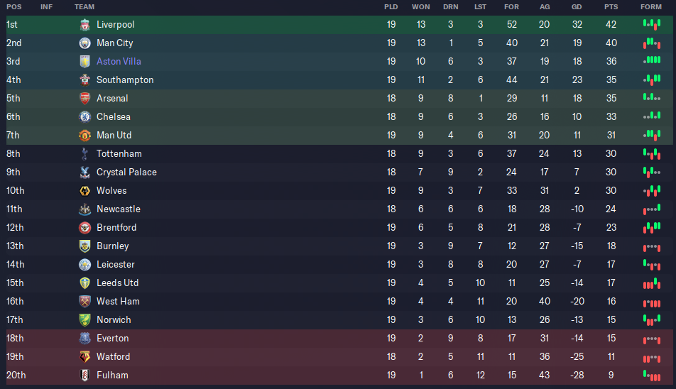 Therefore after 19 gameweeks, we are 3rd in the Premier League with 10-6-3 record and 36 points. Some teams have played one game less than us, but nevertheless we should be pleased with the season so far. Ironically enough, this is a very similar position than what we had last season during this time and remains to been if we can keep this form up or will there be another 2nd half collapse.
