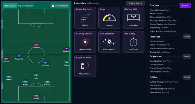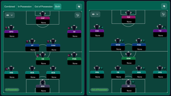 FM26’s new tactical system (separate in- and out-of-possession shapes, smarter role behaviours, and dynamic width logic) finally makes it possible to rebuild PSG’s 2024-25 positional structure — a system built on order, movement, and total control.