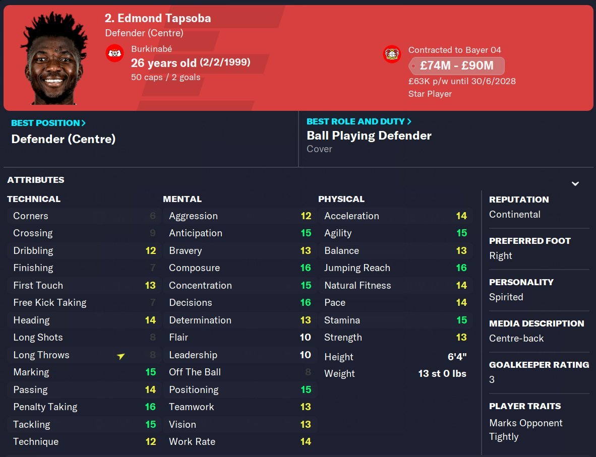 Edmond Tapsoba profile in Football Manager 2026. Edmond Tapsoba is a 23 years old professional footballer from Burkina Faso. His preferred foot is Right and the best role is No-Nonsense Centre-Back. In the first season of FM26, he is contracted to Bayer 04 until 30-Jun-2026 earning £50K per week and has a market value of 36M. You can help the player reach that full FM26 potential with proper training.
