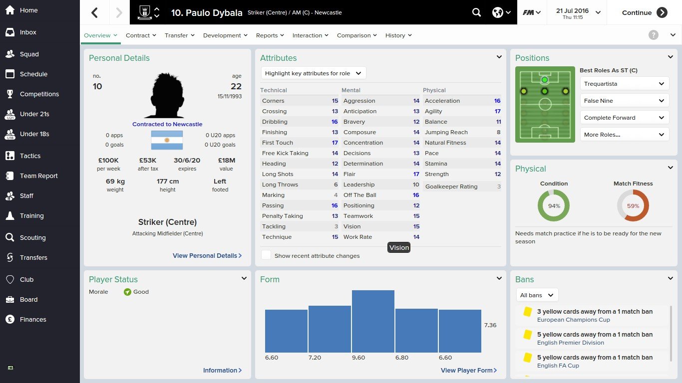 Paulo Dybala profile in Football Manager 2026. Paulo Dybala is a 20 years old professional footballer from Argentina. His preferred foot is Left and the best role is . In the first season of FM26, he is contracted to Palermo until 30-Jun-2016 earning £13K per week and has a market value of 2M. You can help the player reach that full FM26 potential with proper training.