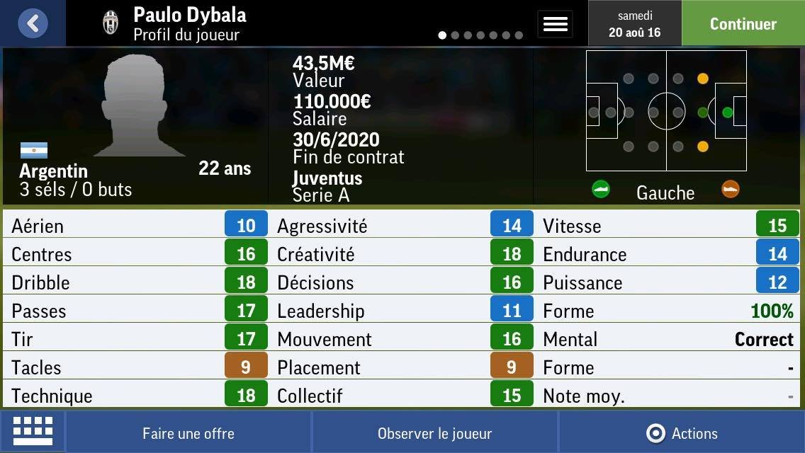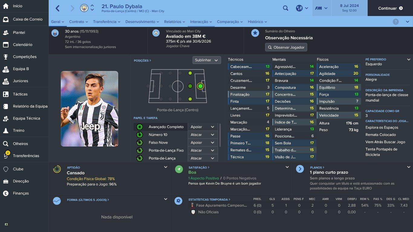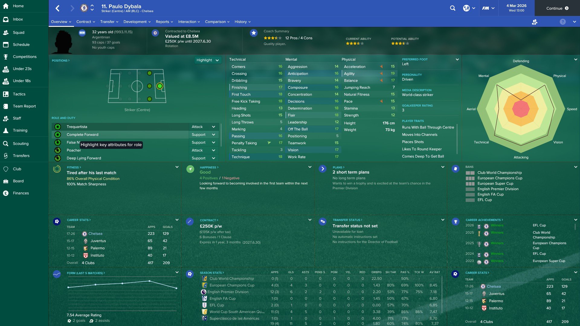 Paulo Dybala profile in Football Manager 2026. Paulo Dybala is a 22 years old professional footballer from Argentina. His preferred foot is Left and the best role is . In the first season of FM26, he is contracted to Juventus until 30-Jun-2020 earning £92K per week and has a market value of 32M. You can help the player reach that full FM26 potential with proper training.