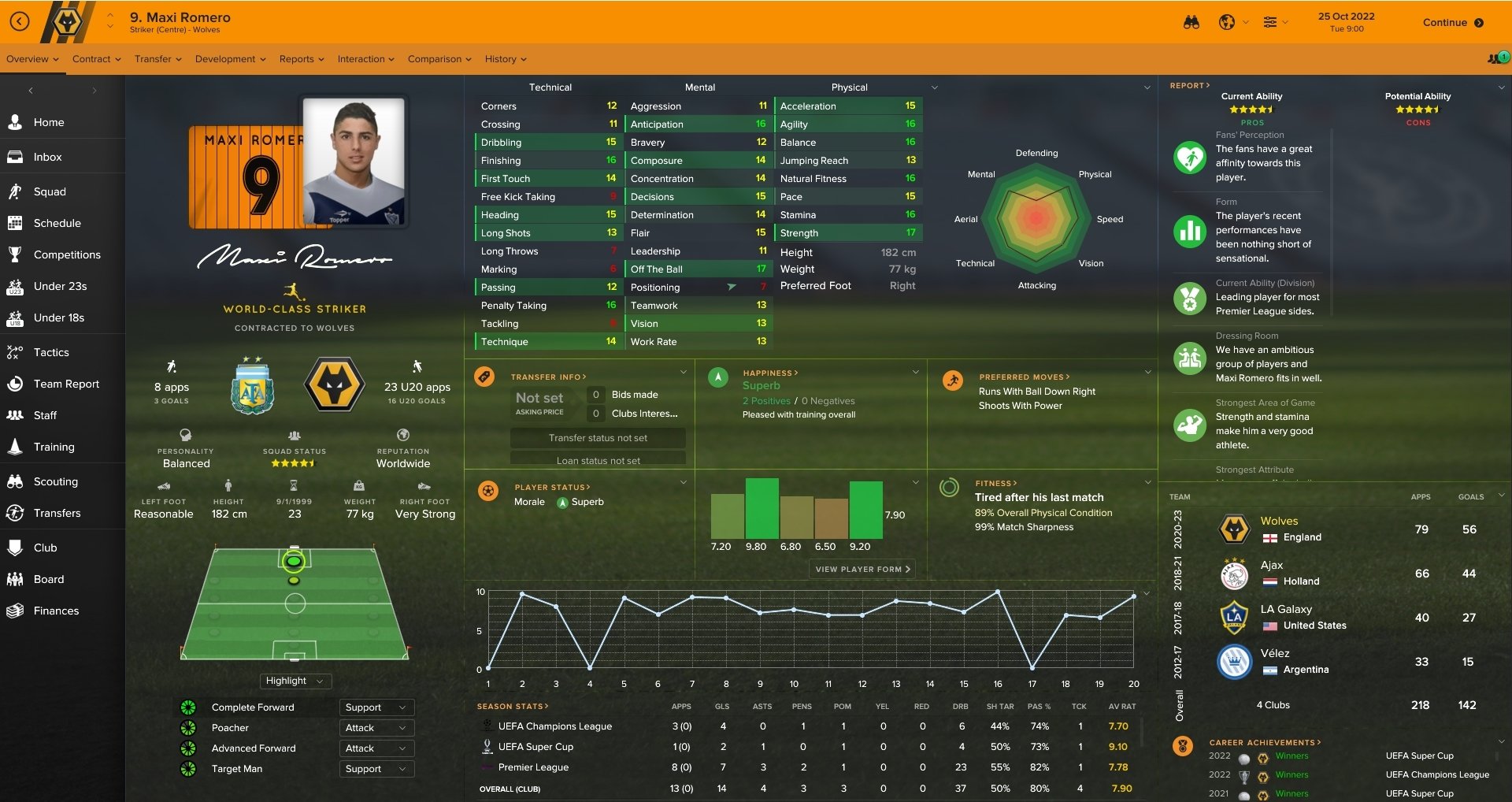 I have almost exclusively deployed him as a complete forward with support duty but Romero's stats are well rounded enough that you can use him in other striker roles aswell. Physically he is exceptional he isnt the tallest, but far from the smallest. He is quite bulky which helps his strength but far from slow (15 acc 15 pace). Adept with both head and feet (it says that his left foot is reasonable but trust me when i say he is two footed) and incredibly good off the ball and has left some of the greatest defenders in the world for dead with amazing runs. Passing is a bit weak at only 12 but he more than good enough to play quick one-twos and through balls to wingers. Ice cold from the spot and is very dependable makes him a complete package all things considered.