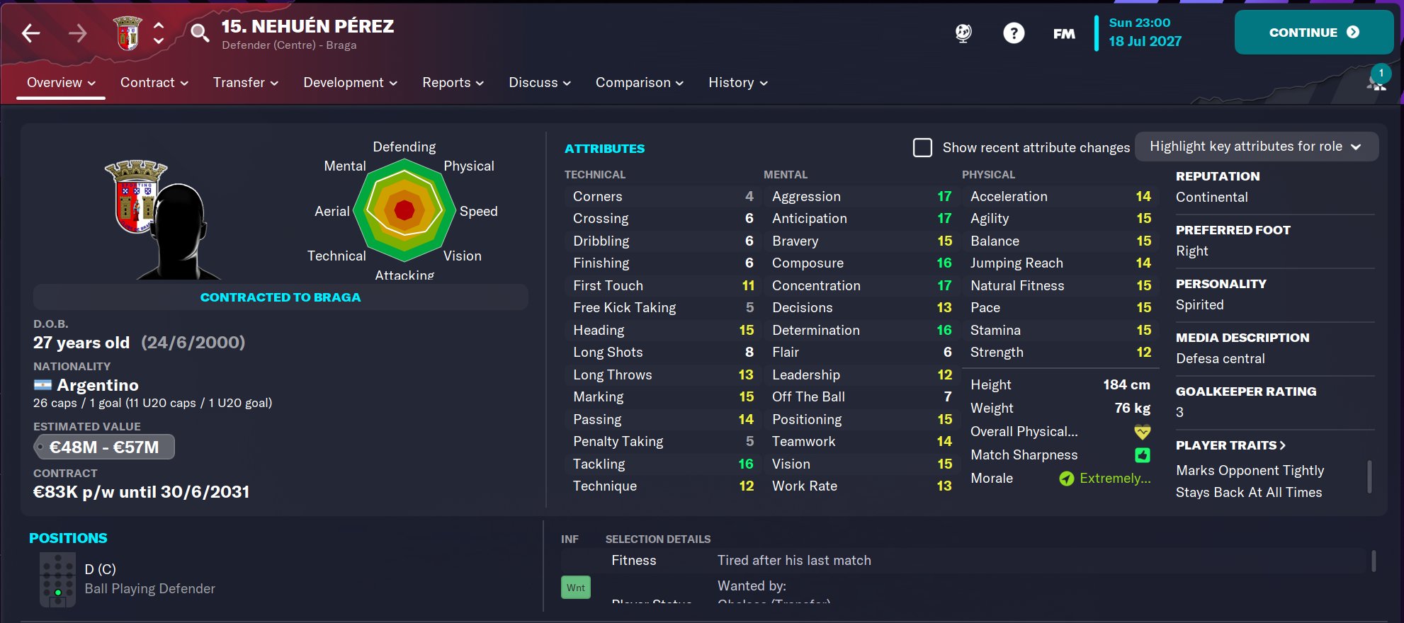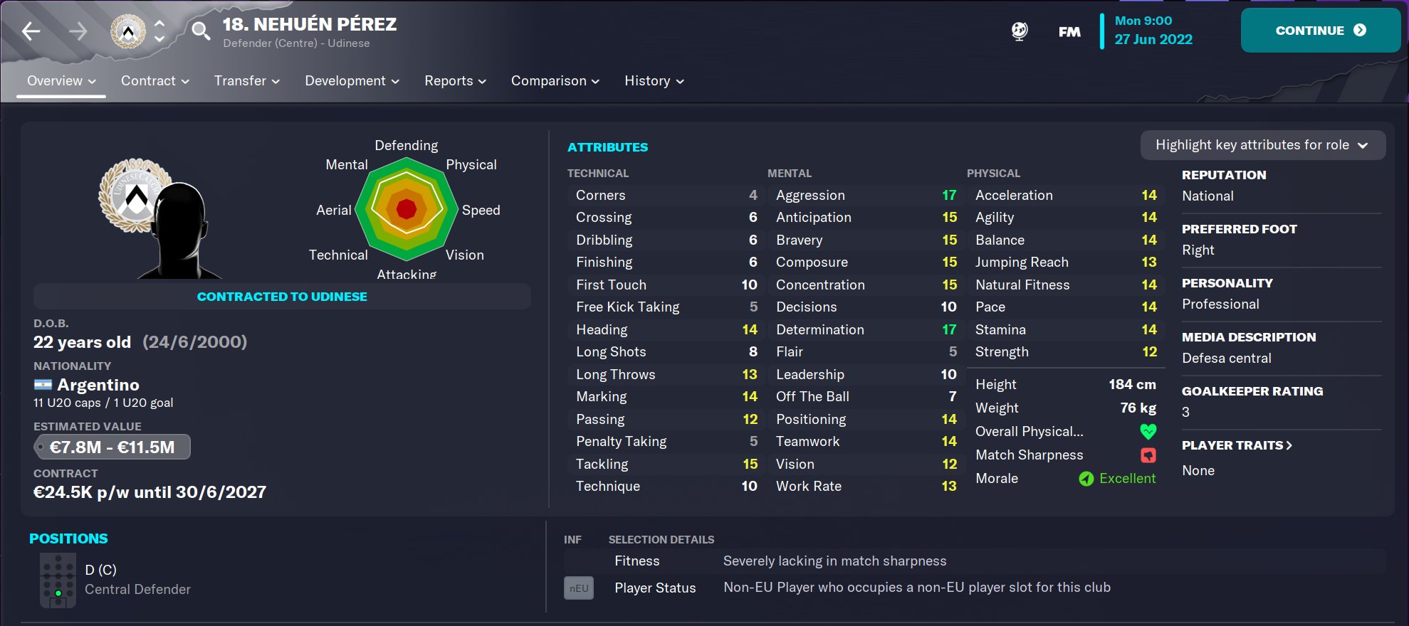 Nehuén Pérez profile in Football Manager 2024. Nehuén Pérez is a 22 years old professional footballer from Argentina. His preferred foot is Right and his best role is No-Nonsense Centre-Back. In the first season of FM24, he is contracted to Udinese until 30-Jun-2027 earning £24K per week and has a market value of 15M. You can help him reach his full FM24 potential with proper training.