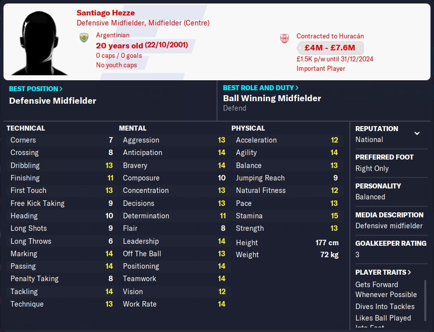 Santiago Hezze profile in Football Manager 2024. Santiago Hezze is a 20 years old professional footballer from Argentina. His preferred foot is Right Only and his best role is Ball Winning Midfielder. In the first season of FM24, he is contracted to Huracán until 31-Dec-2024 earning £1K per week and has a market value of 5M. You can help him reach his full FM24 potential with proper training.