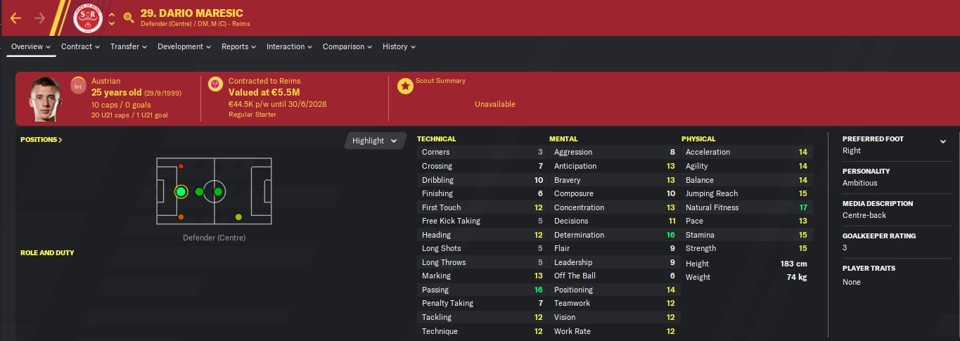 Dario Maresic profile in Football Manager 2023. Dario Maresic is a 19 years old professional footballer from Austria. His preferred foot is Right and the best role is No-Nonsense Centre-Back. In the first season of FM23, he is contracted to Reims until 30-Jun-2024 earning £9K per week and has a market value of 3M. You can help the player reach that full FM23 potential with proper training.