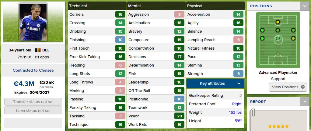 Eden Hazard profile in Football Manager 2023. Eden Hazard is a 23 years old professional footballer from Belgium. His preferred foot is Either and the best role is . In the first season of FM23, he is contracted to Chelsea until 30-Jun-2020 earning £186K per week and has a market value of 36M. You can help the player reach that full FM23 potential with proper training.