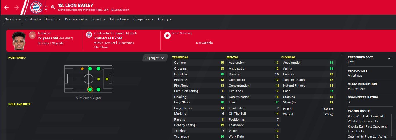 Leon Bailey profile in Football Manager 2026. Leon Bailey is a 21 years old professional footballer from Jamaica. His preferred foot is Left and the best role is Winger. In the first season of FM26, he is contracted to Bayer 04 until 30-Jun-2023 earning £66K per week and has a market value of 33M. You can help the player reach that full FM26 potential with proper training.