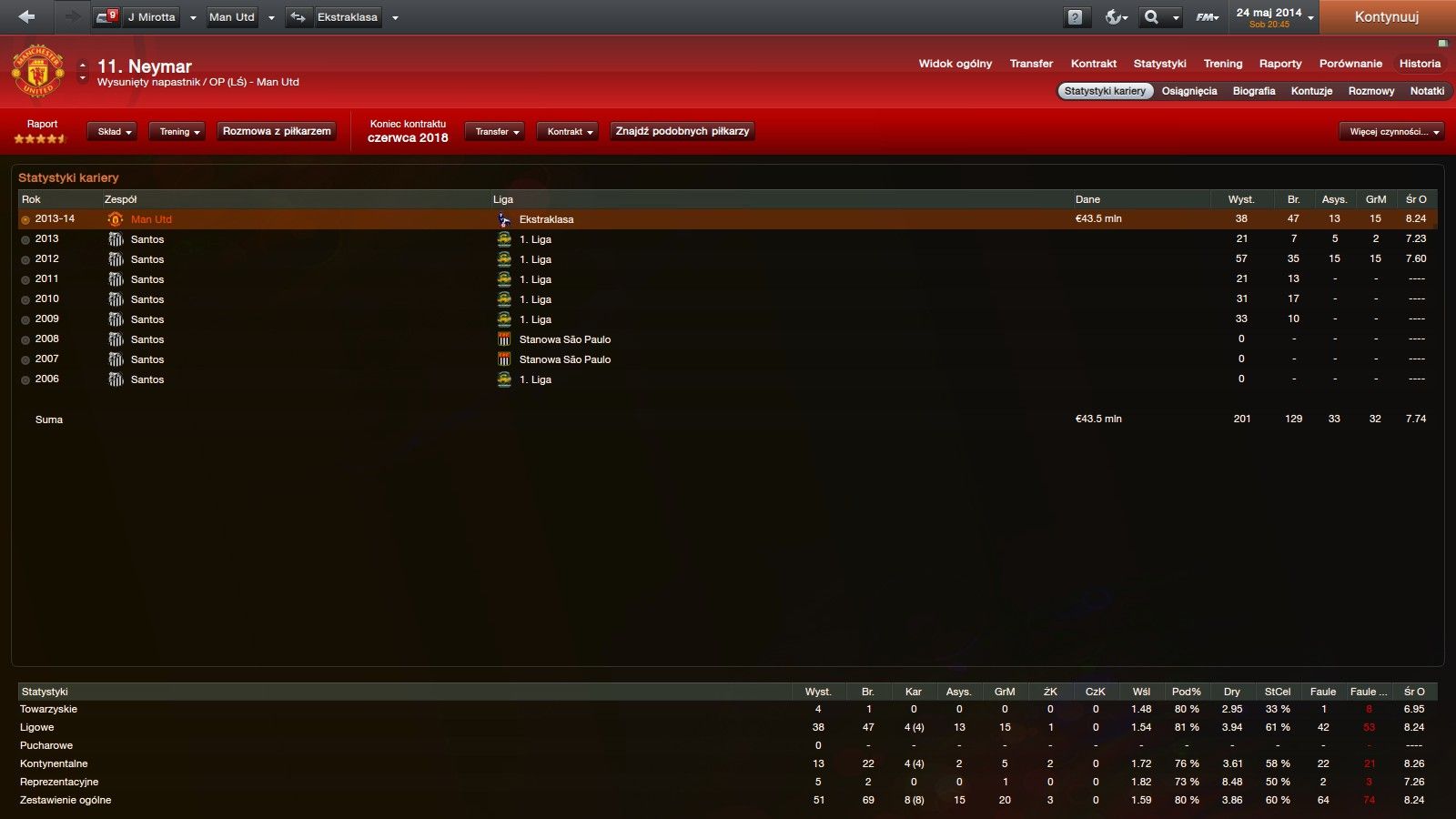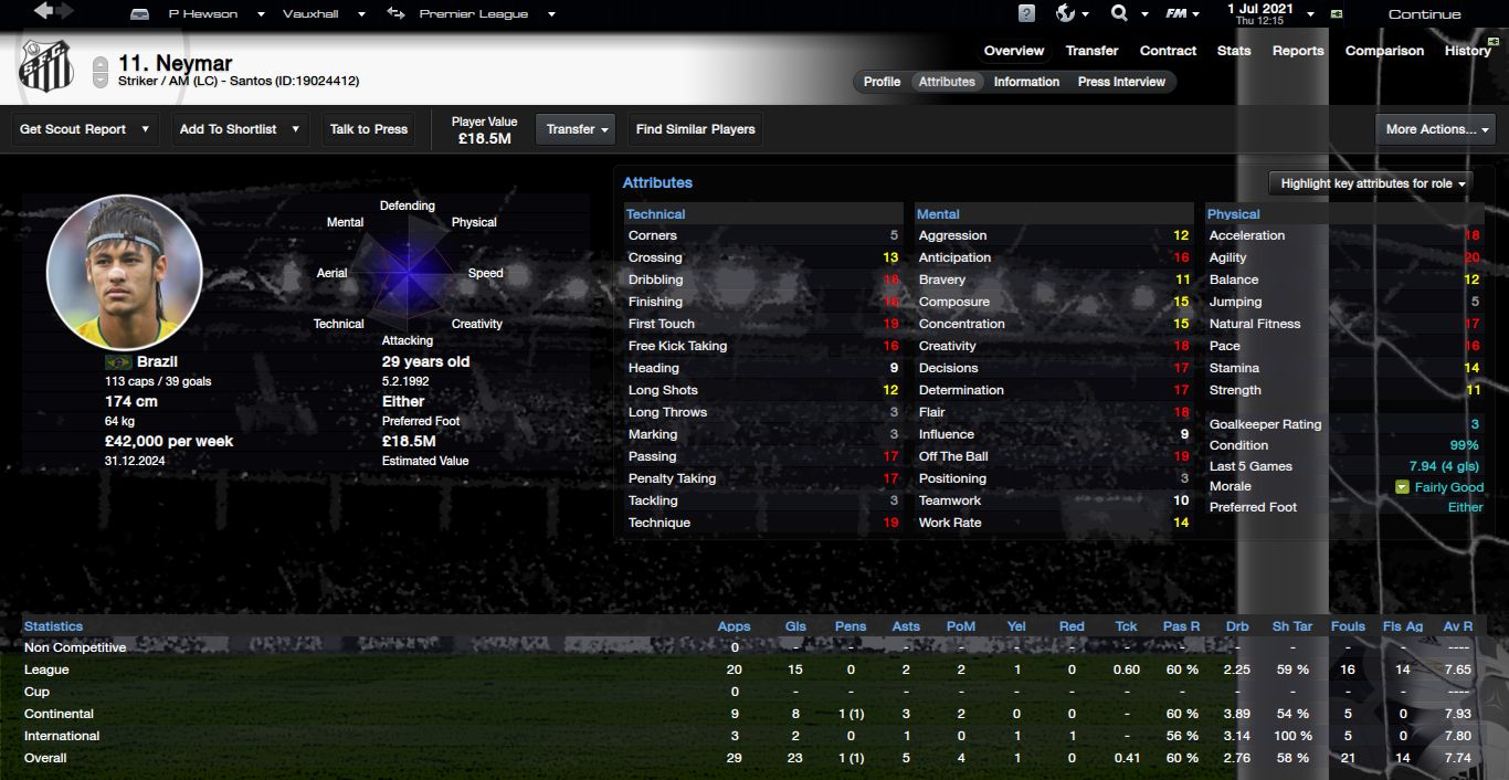 Neymar profile in Football Manager 2026. Neymar is a 20 years old professional footballer from Brazil. His preferred foot is Either and the best role is . In the first season of FM26, he is contracted to Santos until 13-Jul-2014 earning £23K per week and has a market value of 21M. You can help the player reach that full FM26 potential with proper training.