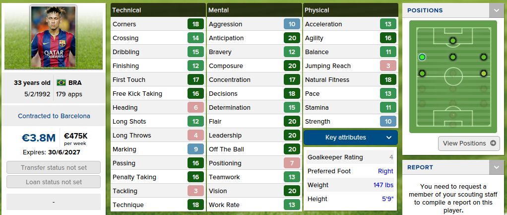 Neymar profile in Football Manager 2026. Neymar is a 22 years old professional footballer from Brazil. His preferred foot is Either and the best role is . In the first season of FM26, he is contracted to Barcelona until 30-Jun-2018 earning £191K per week and has a market value of 31M. You can help the player reach that full FM26 potential with proper training.