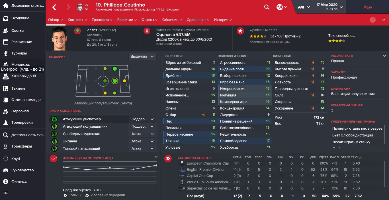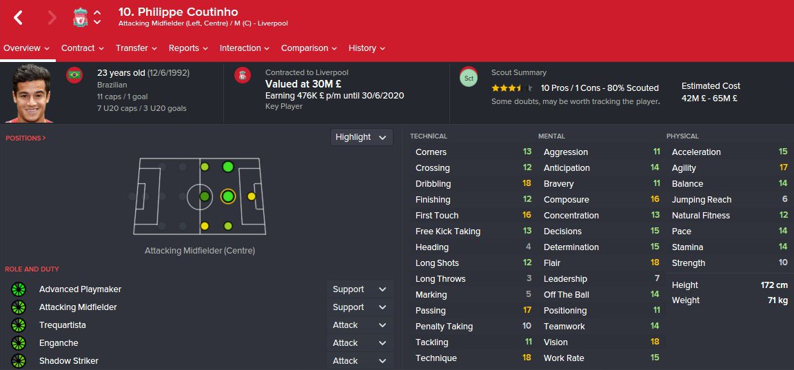 Philippe Coutinho profile in Football Manager 2026. Philippe Coutinho is a 23 years old professional footballer from Brazil. His preferred foot is Right and the best role is . In the first season of FM26, he is contracted to Liverpool until 30-Jun-2020 earning £110K per week and has a market value of 30M. You can help the player reach that full FM26 potential with proper training.