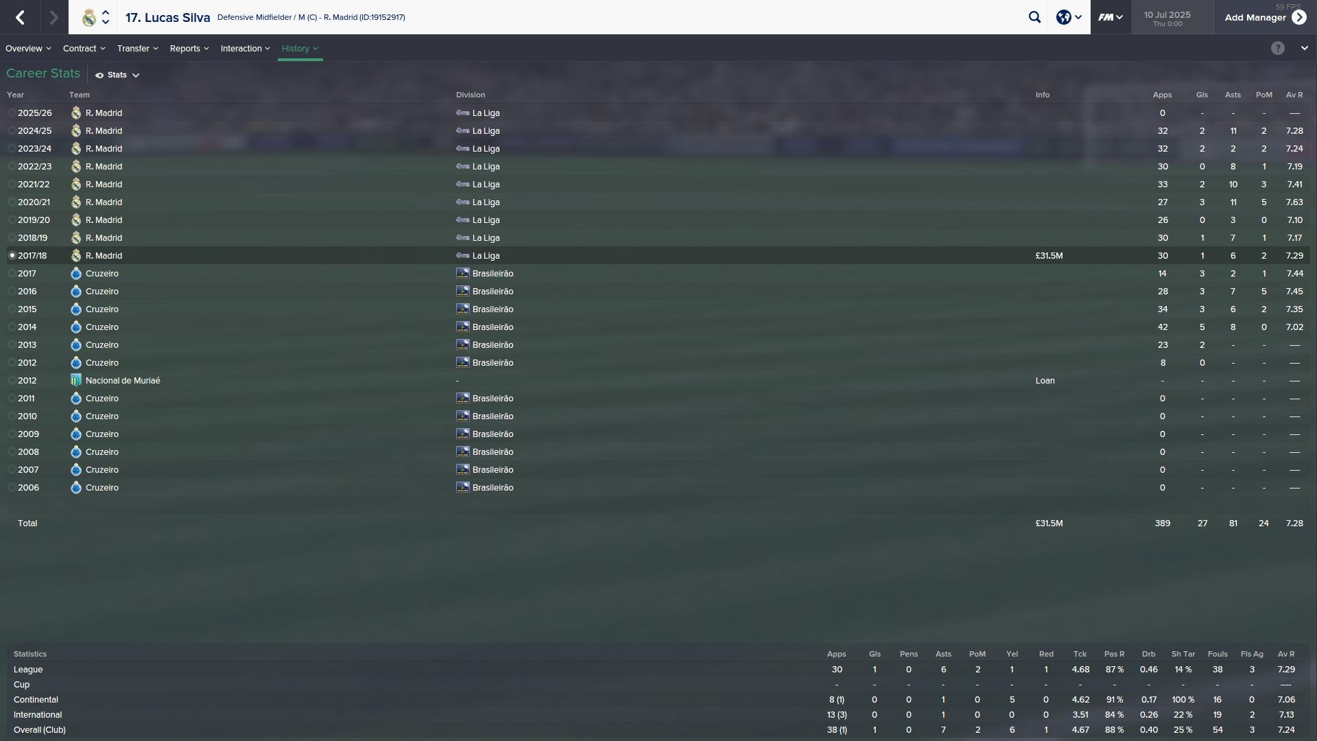 Lucas Silva profile in Football Manager 2026. Lucas Silva is a 21 years old professional footballer from Brazil. His preferred foot is Right and the best role is . In the first season of FM26, he is contracted to R. Madrid until 30-Jun-2020 earning £51K per week and has a market value of 6M. You can help the player reach that full FM26 potential with proper training.